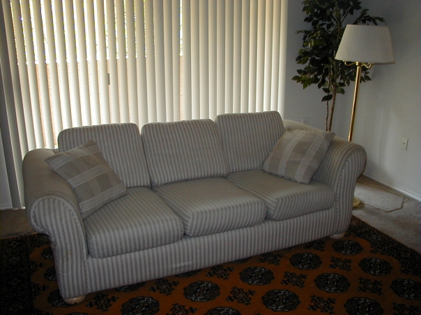 The living area has a striped white-gray sofa, a floor lamp and tan with black area rug.