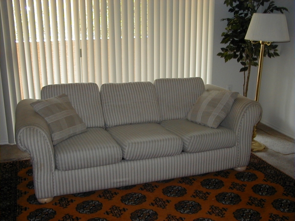 Contemporary Sofa, neutral colors, striped design with solid neutral arms, blond wood legs. Sturdy and comfortable, in good condition, no stains or tears.