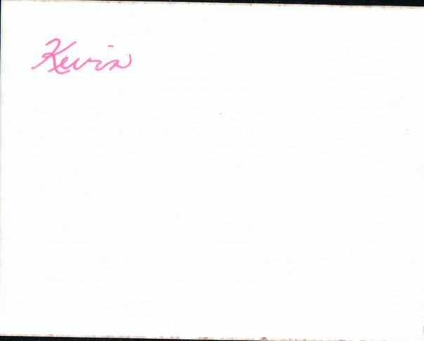 A piece of paper with the word Kevin written in pink ink.