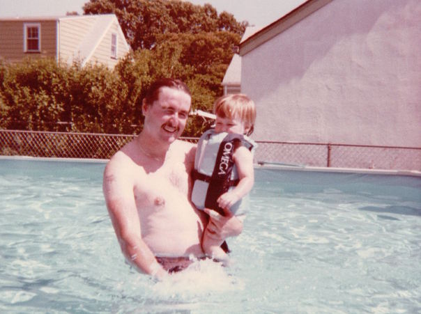 A MAN AND A BABY WEARING LIFE JACKET IN A SWIMMING POOL ON A SUNNY DAY.