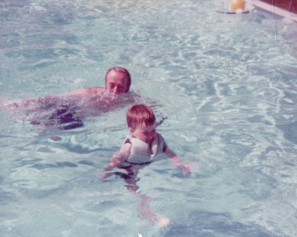 A Dad was teaching his son swimming .Dad is the first hero for every son .