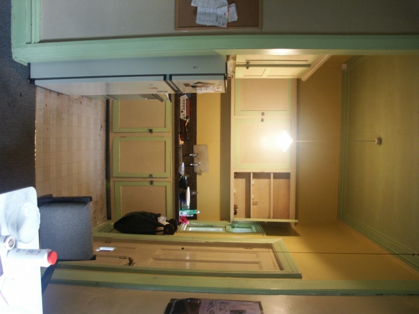 This is a kitchen with greenish painted trim. There is a hanging light.