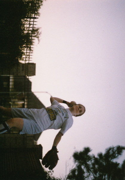 The girl has a baseball glove on her hand and is near a tree that is green in color. |