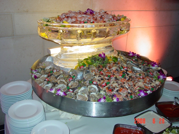 There is a display of different seafood food in a buffet table