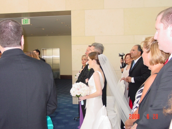 The ceremony was on the gallery level of the Hobby Center in Houston - a three story view out of a five story building. After the wedding ceremony itself, there was a one hour mini-party on the floor below, and then the full reception the floor before that. All of the floors could be seen from the ground floor (so the 2nd and 3rd floors acted more like balconies). It was actually a pretty spectacular place to host such an event.