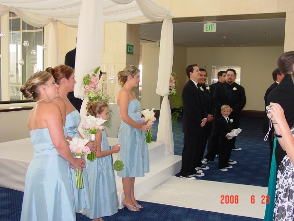 The ceremony was on the gallery level of the Hobby Center in Houston - a three story view out of a five story building. After the wedding ceremony itself, there was a one hour mini-party on the floor below, and then the full reception the floor before that. All of the floors could be seen from the ground floor (so the 2nd and 3rd floors acted more like balconies). It was actually a pretty spectacular place to host such an event.