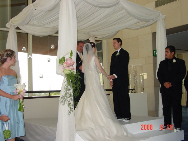 The ceremony was on the gallery level of the Hobby Center in Houston - a three story view out of a five story building. After the wedding ceremony itself, there was a one hour mini-party on the floor below, and then the full reception the floor before that. All of the floors could be seen from the ground floor (so the 2nd and 3rd floors acted more like balconies). It was actually a pretty spectacular place to host such an event.