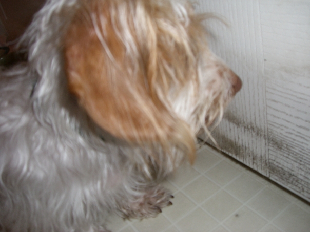 Dog with shaggy, long, brown and white hair, on tan linoleum.