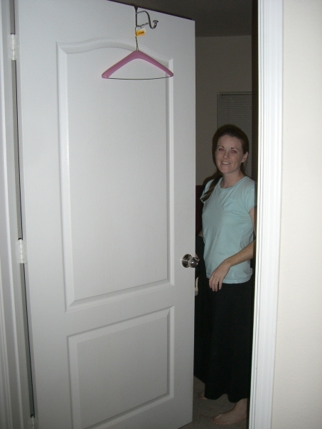A smiling woman with a blue shirt and a dark skirt behind a half opened door with a pink hanger attached to it