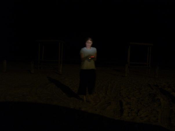 A young ethereal girl, standing on an empty beach on a starless night holding an unidentifiable glowing object
