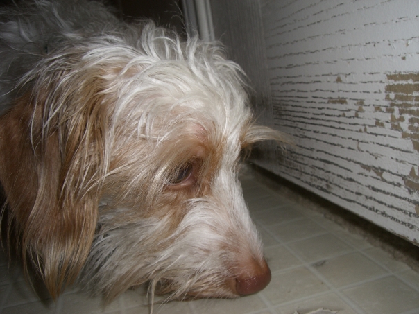 Close up picture of a dog's face who has long, white and tan hair, a tan nose, and HUGE brown eyes that appear tender, gentle, and warm, is standing on linoleum floor with tan squares, and white lines.