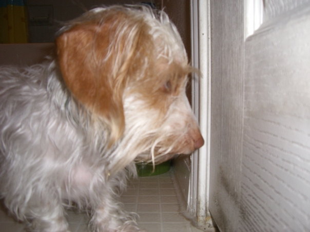 Here is what looks to be a grumpy and ticked off dog. It does not look like it is happy about much of anything. From what you can tell it looks to be some kind of mutt like dog as you see the fur is all mangled and ratty.
