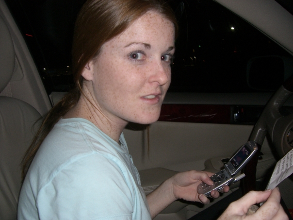 A young woman with reddish hair and freckles is sitting in a car and holding a silver flip cell phone.