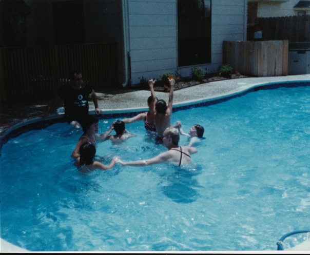 A group of happy people are playing in an outdoor in-ground swimming pool.