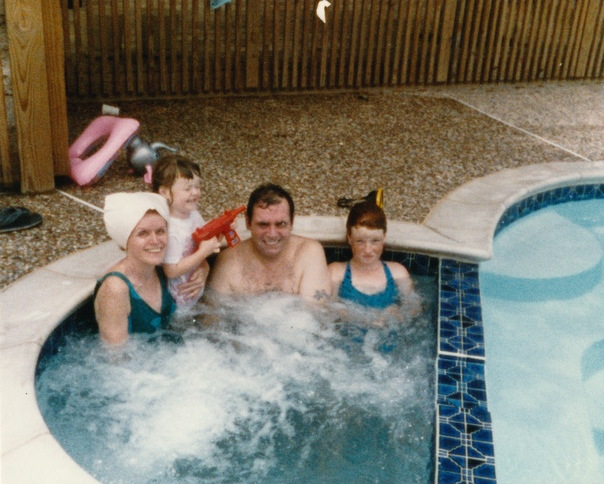 Mom, Dad and 2 beautiful girls with amazing smiles on their faces enjoying time in a jacuzzi