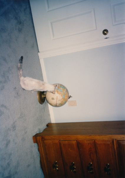 cat is sitting on ground near the door and watching the globe
