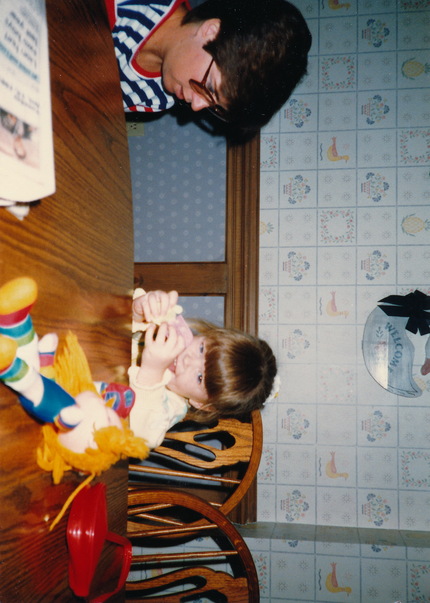 Mother implores her young daughter to eat real food instead of the hair of her plastic doll.