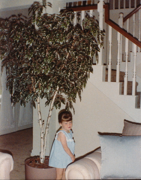 A little girl in a blue dress standing in front of an indoor tree next to a sofa.