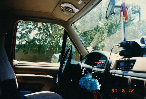 The interior of a police vehicle with a small bloom of blue hydrangeas sit next to the steering column.