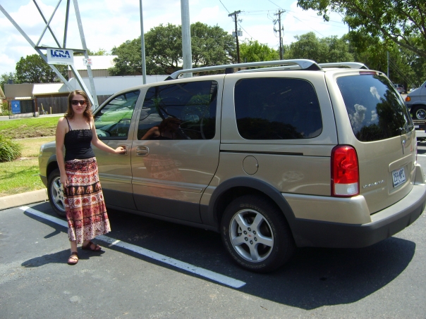 A woman in a tank top and skirt standing next to a minivan in a parking lot.