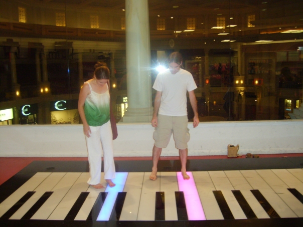 Having fun playing with an extra-large piano, just like Tom Hanks in the movie "Big"!