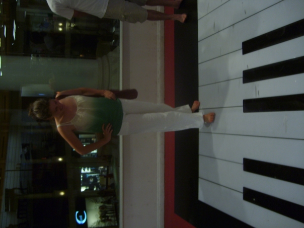 I sideways picture of a woman standing on an over-sized piano keys.