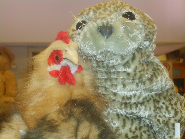 Children's toys of a stuffed furry chicken and a sea lion cuddle together