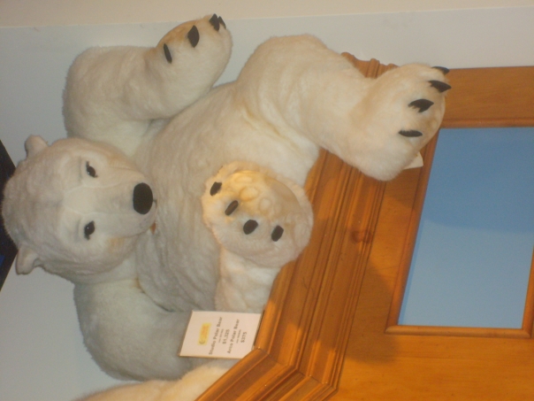 A big, white, stuffed polar bear sitting on what appears to be a shelf of some kind of a railing.