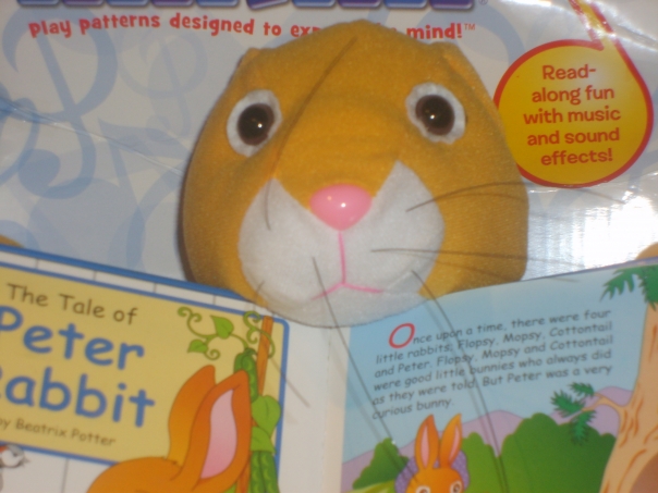 A stuffed animal named Peter Rabbit holds a children's book written about him.