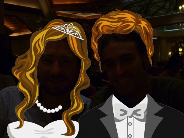 Two young men have cartoon graphics around them that depict them as bride and groom.