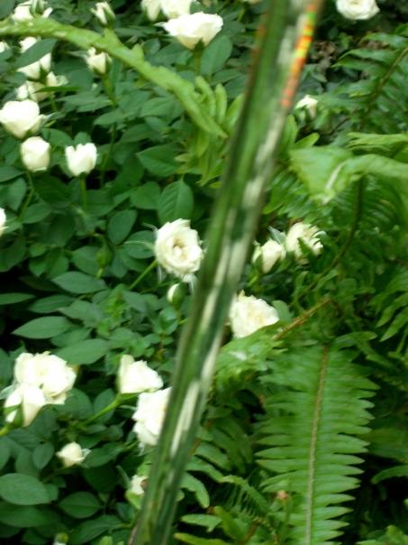 White roses growing in a garden with green fern fronds.