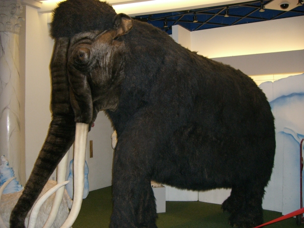 a fake black elephant with very large tusks and very small ear. it was taken indoors.