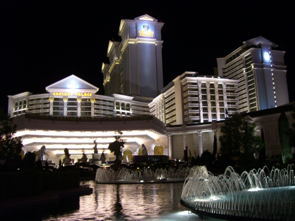 Caesars Palance on a dark night with the fountains going and all lit up.