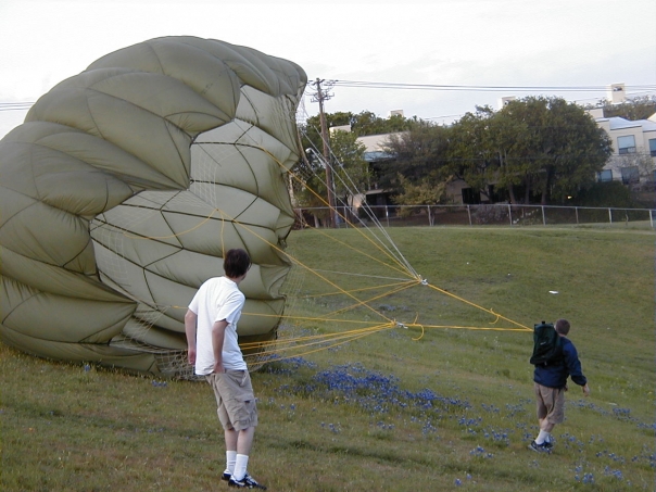 Dave and I were watching Klaus practice some para-gliding maneuvers one afternoon at the Murchinson Middle school hill when a couple of kids that had gotten their hands on a parachute showed up.