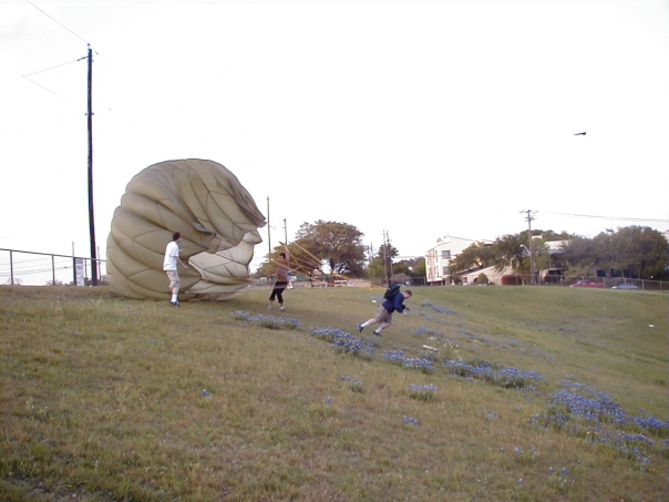 Dave and I were watching Klaus practice some para-gliding maneuvers one afternoon at the Murchinson Middle school hill when a couple of kids that had gotten their hands on a parachute showed up.