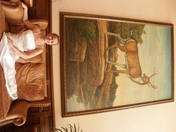 Young woman in white dress reclined on a tan leather loveseat underneath large painting of a deer