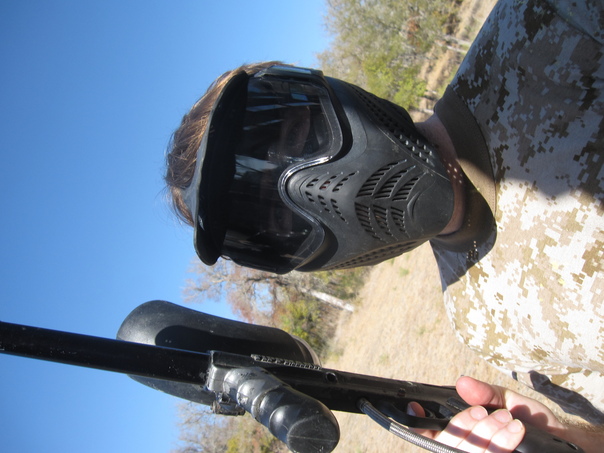 A man wearing camouflage and wearing a black mask is holding a black paintball gun.