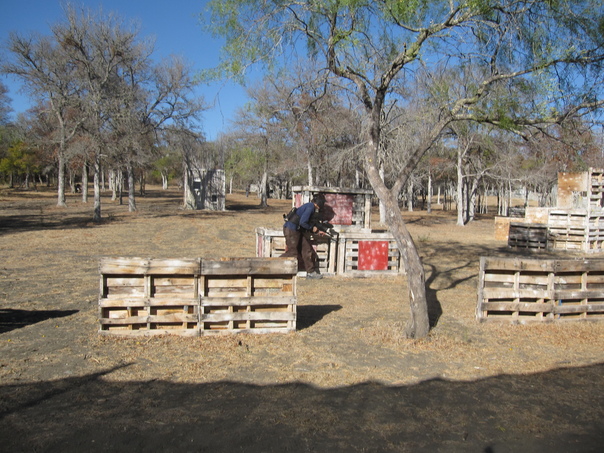 A man dressed in warm clothes stalks about in a dirty field while hiding behind wooden structures and carrying a large rifle.