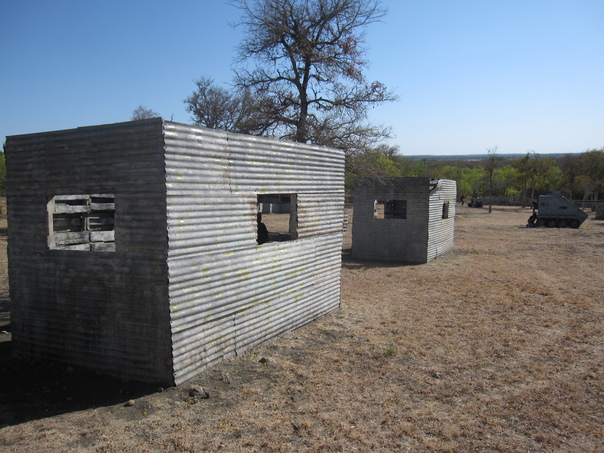 Two small open sheds, made of corrugated steel, are in a dirt field