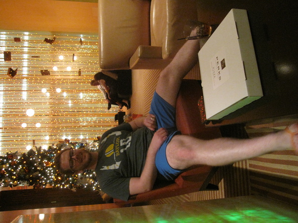 a man is wearing green t-shirt and blue shorts is sitting on the sofa and a x-mas tree is glittering behind him.