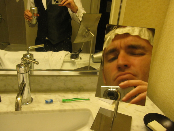 Two different mirrors are placed to show the person who holds a digital camera and looks in front of these.