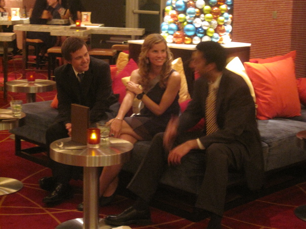 It's a beautiful restaurant having glitters by the light. Here three peoples are talking with relaxation.