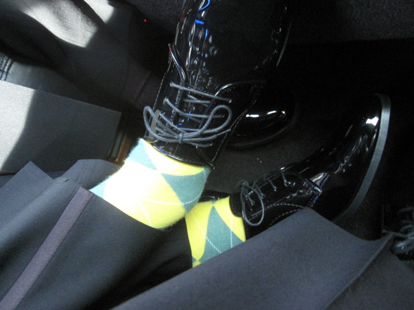 black, shiny, shoes, colorful, socks, yellow, pants, dressy, green, crossed, reflection, tied, legs, gray,