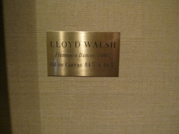 A shiny brass plate gives information about a painting while affixed to a very clean, ribbed surface.