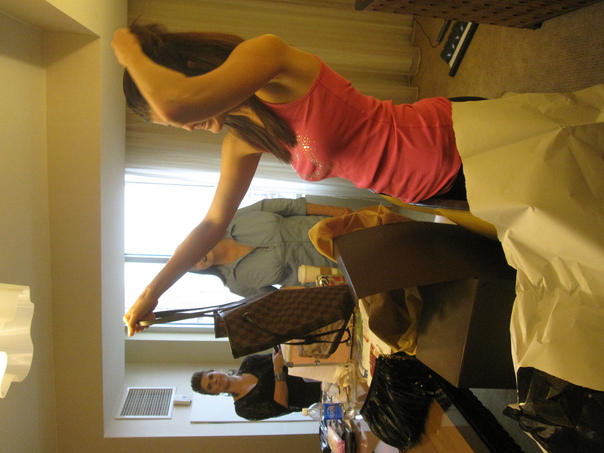 the place looks like a beauty parlour and the lady shows a hand bag to her friend and she try to clip her hair