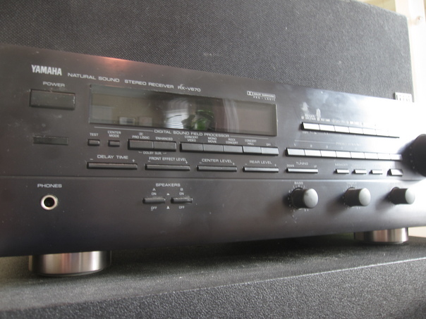 This is a Yamaha brand home entertainment stereo receiver in black with metallic feet.