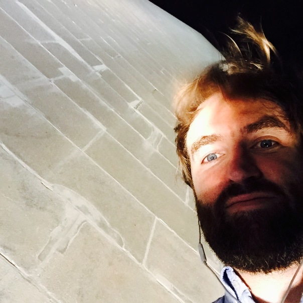A bearded man wearing a blue shirt stares at the camera, while a bright light focuses on his face.