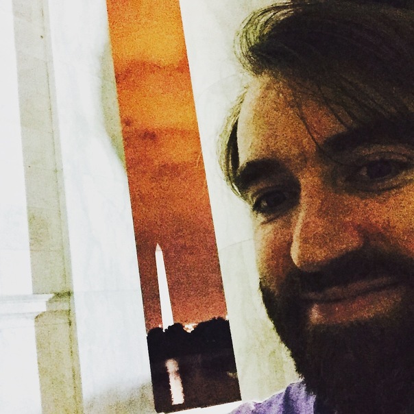 a bearded man smiles slightly in a front of a monument in washington dc.