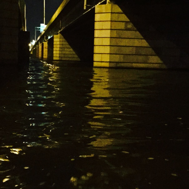 In the middle of the night, it appears that the streets and tunnels of the city are flooded with high water.