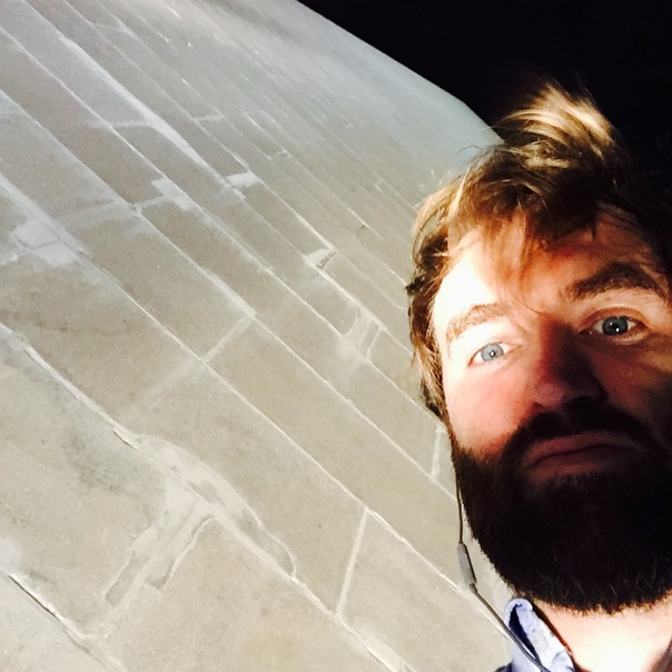 a bearded man has his face lit up slightly by the camera as he looks down.